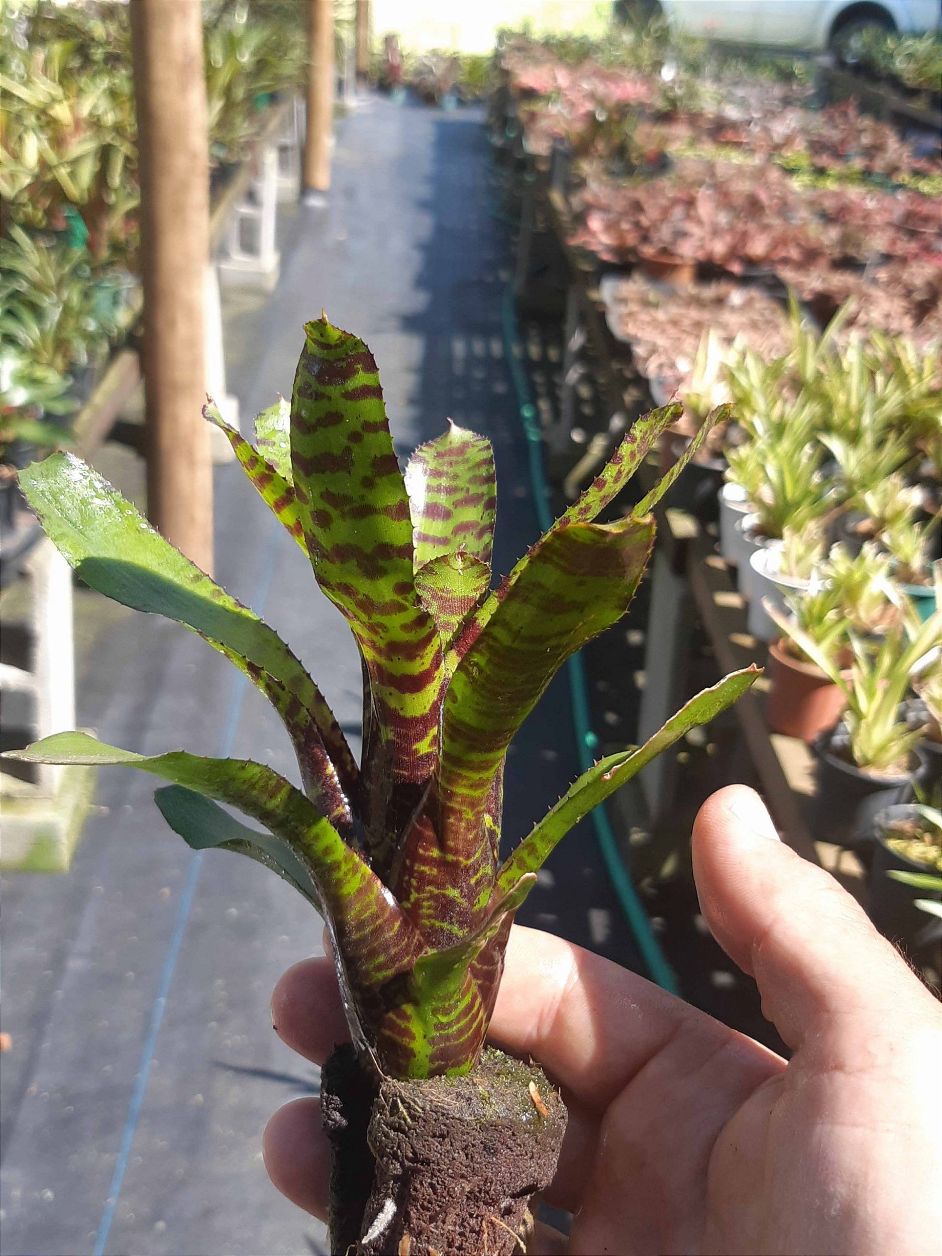 Rega: A rega é fundamental: mantenha o "tanque" central da roseta sempre preenchido com água (preferencialmente água da chuva ou filtrada), trocando-a a cada poucos dias para evitar a proliferação de mosquitos e acúmulo de algas/detritos. O substrato deve ser mantido levemente úmido, mas nunca encharcado. Permita que ele seque parcialmente entre as regas. A alta umidade ambiente é benéfica.
