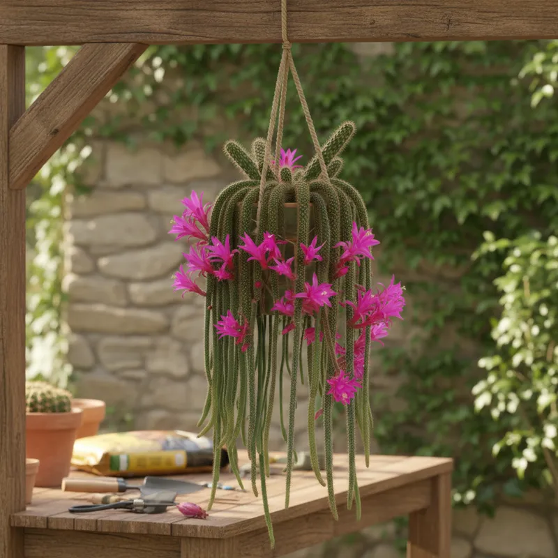 O Cacto Rabo de Rato (Aporocactus flagelliformis), também conhecido como cacto-de-corda ou cacto-rabo-de-gato, é uma planta suculenta de crescimento pendente, amplamente cultivada por sua beleza exótica. Suas hastes cilíndricas, finas e longas, podem atingir até 1 metro de comprimento, com espinhos pequenos e alinhados que lhe conferem um visual peculiar. Originário de regiões desérticas do México e da América Central, esse cacto é ideal para compor jardins suspensos, vasos pendentes ou arranjos de suculentas. Durante a primavera e o verão, ele produz flores grandes, tubulares e de coloração rosa intensa, que adicionam um charme especial ao ambiente.