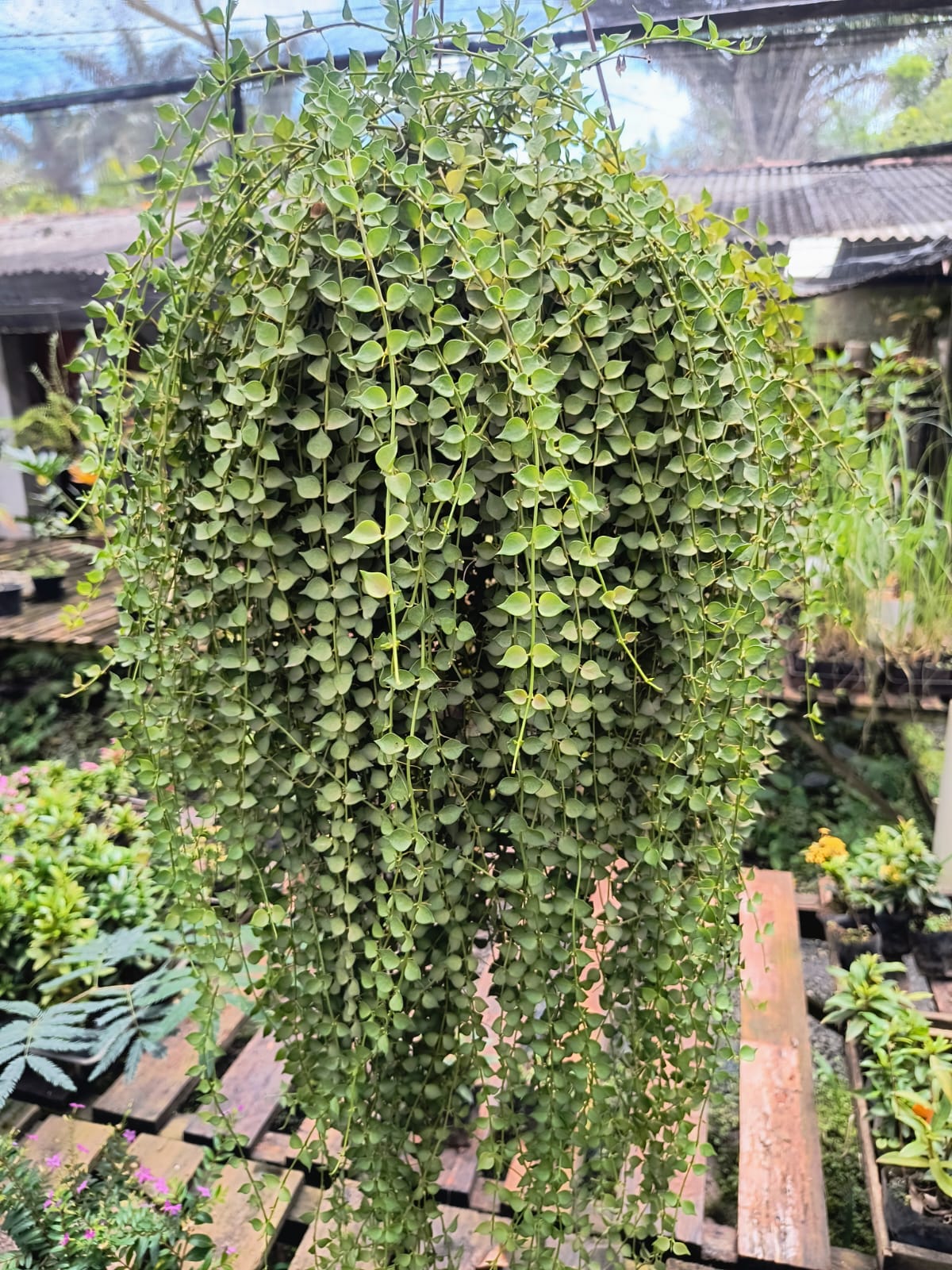 A Dischidia ruscifolia, conhecida como Planta Botão de Rosa, flor de Cera Coração ou Corrente de Botão, é uma planta epífita de crescimento pendente, apreciada por suas pequenas folhas em formato de coração e seu aspecto delicado. Suas folhas são de um verde intenso e suculento, e crescem ao longo de caules finos, criando uma cascata de folhagem que a torna ideal para vasos suspensos ou terrários. Além de sua aparência ornamental, é uma planta de fácil cultivo e baixíssima manutenção, perfeita para quem busca adicionar um toque verde a ambientes internos.