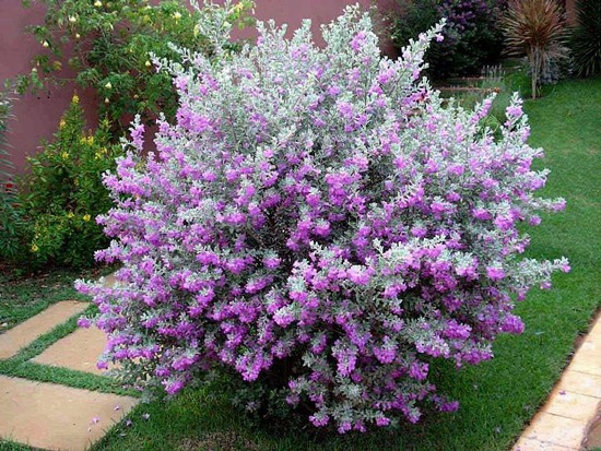 A Folha de Prata (Leucophyllum frutescens). Essa planta é famosa por suas folhas prateadas e seu crescimento denso, formando uma folhagem atraente e compacta, que cria uma cobertura verde prateada. Suas flores são pequenas, mas exuberantes, geralmente de cor lilás a roxa, e aparecem durante o verão, geralmente após chuvas, sendo um espetáculo visual que atrai abelhas, borboletas e outros polinizadores.