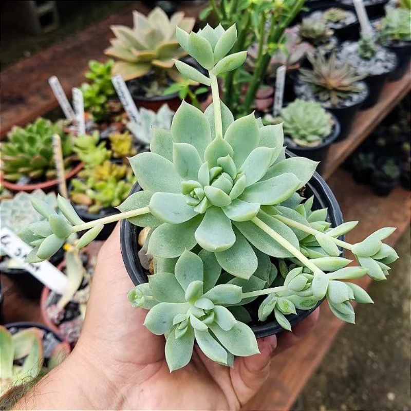 O Graptopetalum macdougallii é uma suculenta rara e delicada, nativa do México, que encanta colecionadores e entusiastas de plantas por sua estética única. Suas folhas são carnudas, em tons que variam entre verde-acinzentado e verde-claro, formando rosetas compactas e simétricas. Essa suculenta é frequentemente usada em arranjos, terrários e composições ornamentais devido ao seu porte pequeno e sua aparência elegante.