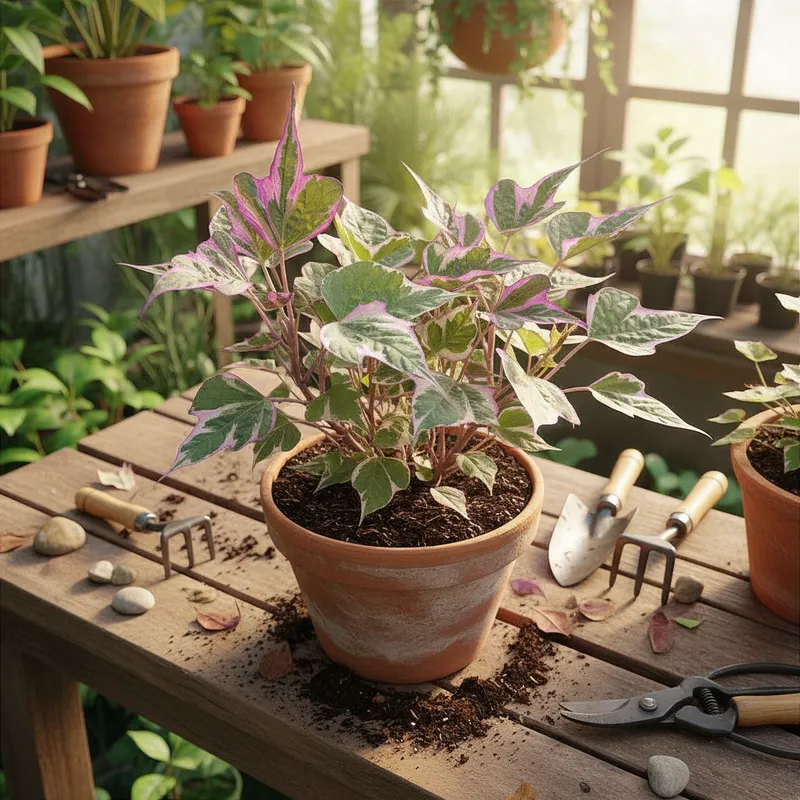 Luminosidade: Para manter a vivacidade da variegação nas folhas e estimular uma floração abundante, a Ipoméia exige sol pleno ou meia-sombra. Em locais com muito pouco sol, a planta tende a produzir ramos mais finos, folhas totalmente verdes e poucas flores. O ideal é que receba ao menos 4 a 6 horas de luz solar direta por dia.