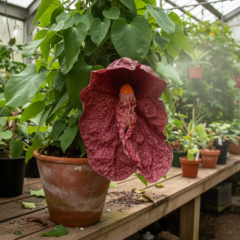 A Aristolochia gigantea, popularmente conhecida como Papo de Peru ou Milhomens, é uma trepadeira de crescimento vigoroso que produz uma das flores mais exóticas e teatrais do mundo botânico. Suas flores gigantescas, que podem atingir até 60 cm de comprimento, possuem um formato único que lembra o papo de uma ave, com uma padronagem intrincada em tons de vinho e marrom sobre um fundo creme. Além de seu visual impressionante, essa planta é uma peça fundamental para jardins de borboletas, sendo a principal fonte de alimento para as lagartas da borboleta-cauda-de-andorinha.