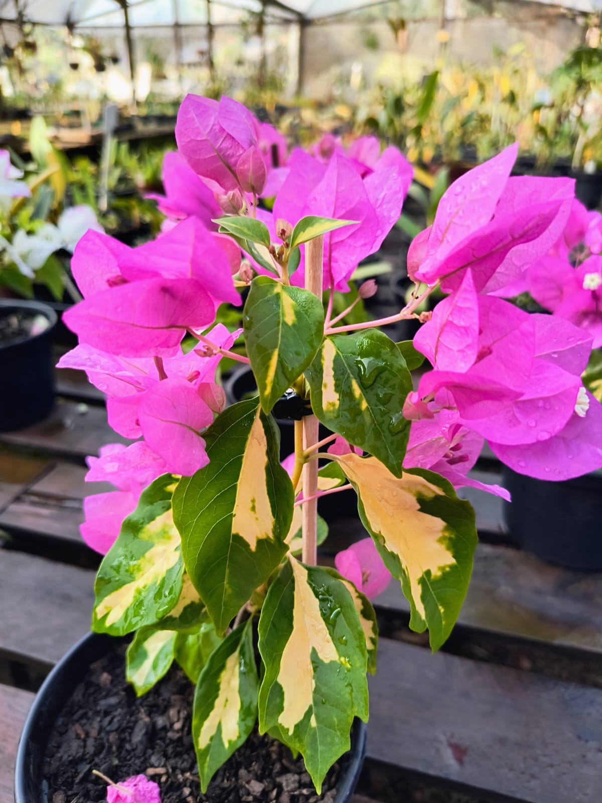 A Primavera Variegata Fúcsia (Bougainvillea spectabilis) é uma trepadeira lenhosa, nativa da América do Sul, que se destaca por sua espetacular floração em fúcsia vibrante em contraste com sua folhagem única e variegada. Diferente da Primavera comum, esta cultivar apresenta folhas que combinam o verde-escuro central com bordas em tons de branco-creme ou amarelo-claro.