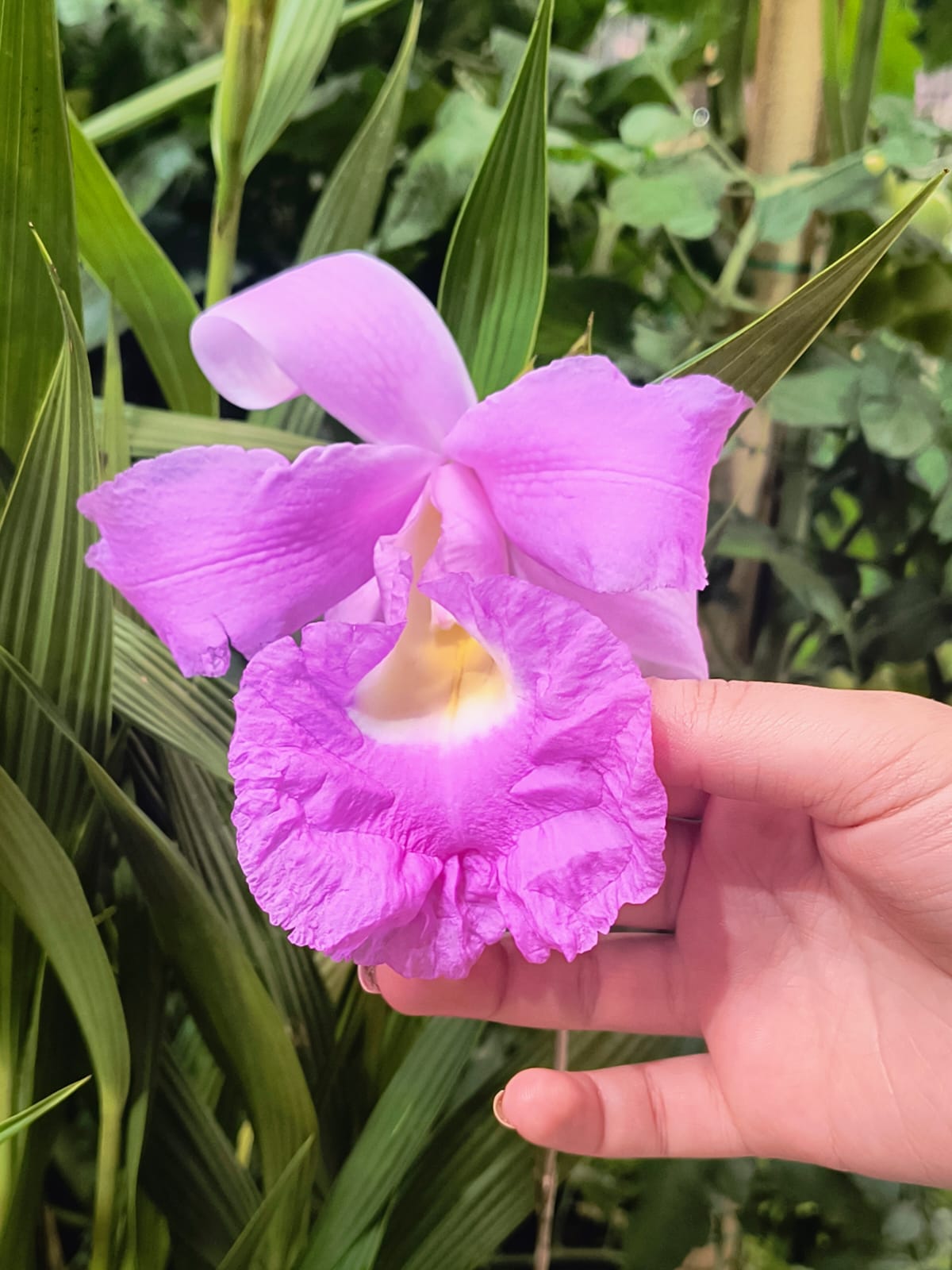 A Sobrália (Sobralia macrantha), popularmente conhecida como Orquídea-Bambu, é uma orquídea terrestre imponente e majestosa, nativa das florestas úmidas do México e da América Central. Ela recebe esse nome popular devido aos seus caules longos, finos e eretos, que podem atingir de 1 a 2 metros de altura, cobertos por folhas plissadas e verdes que lembram muito a folhagem de um bambu. A grande estrela desta planta é a sua floração espetacular. As flores são grandes, podendo chegar a 20 cm de diâmetro, e possuem uma coloração que varia do rosa-púrpura vibrante ao lilás suave (existindo também variedades brancas, a 'alba'), com um labelo franjado e centro amarelado. Uma característica marcante e poética da Sobrália é que suas flores são efêmeras, durando geralmente apenas um ou dois dias. No entanto, a planta floresce sucessivamente na mesma haste por um longo período, garantindo um show contínuo. É uma planta de grande porte, ideal para jardins tropicais, renques junto a muros ou vasos grandes no chão.